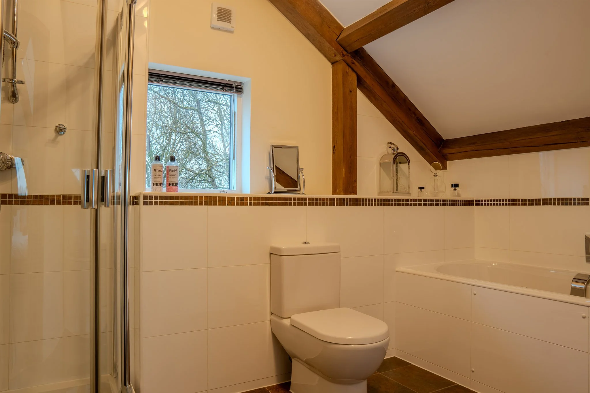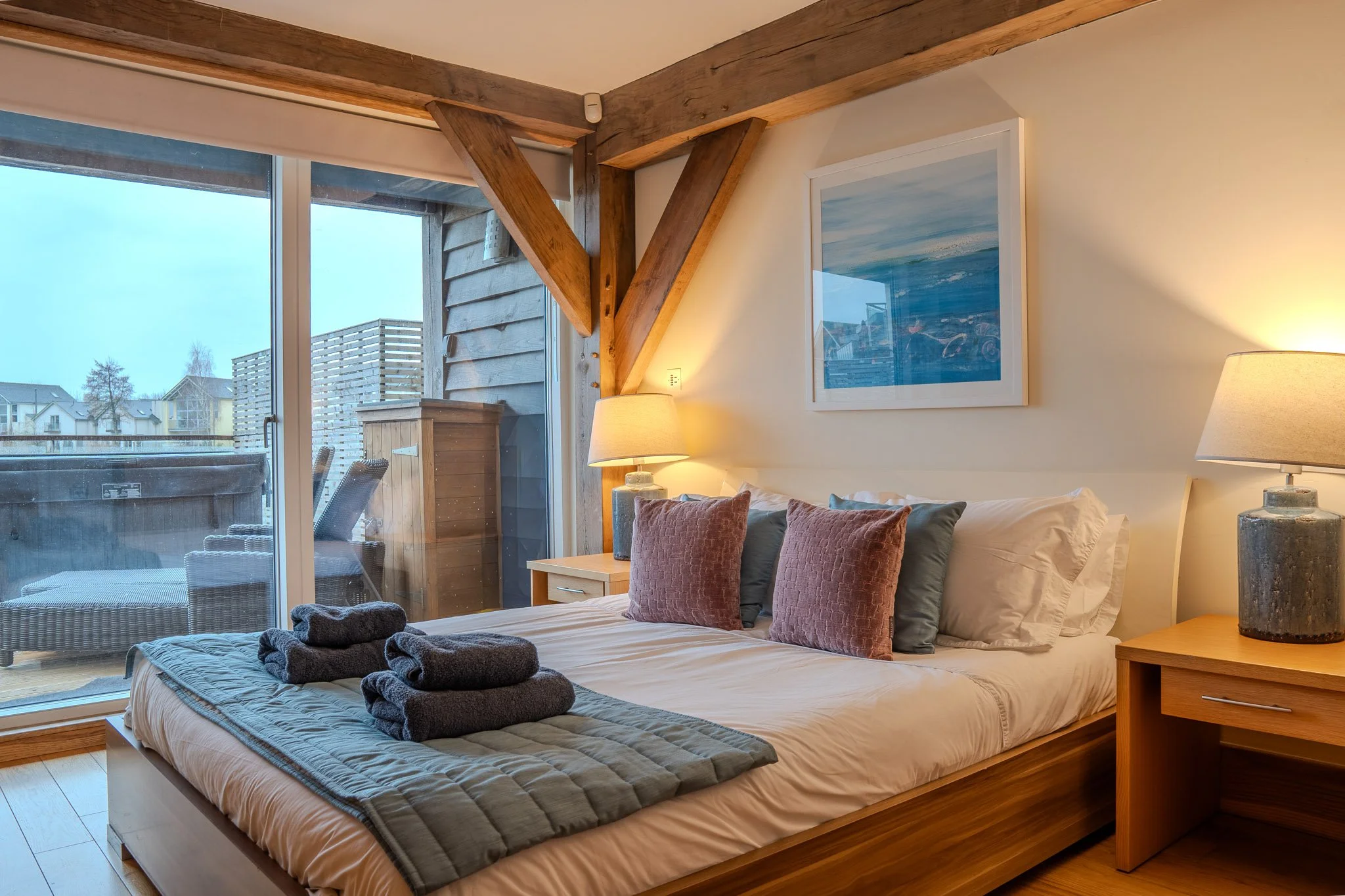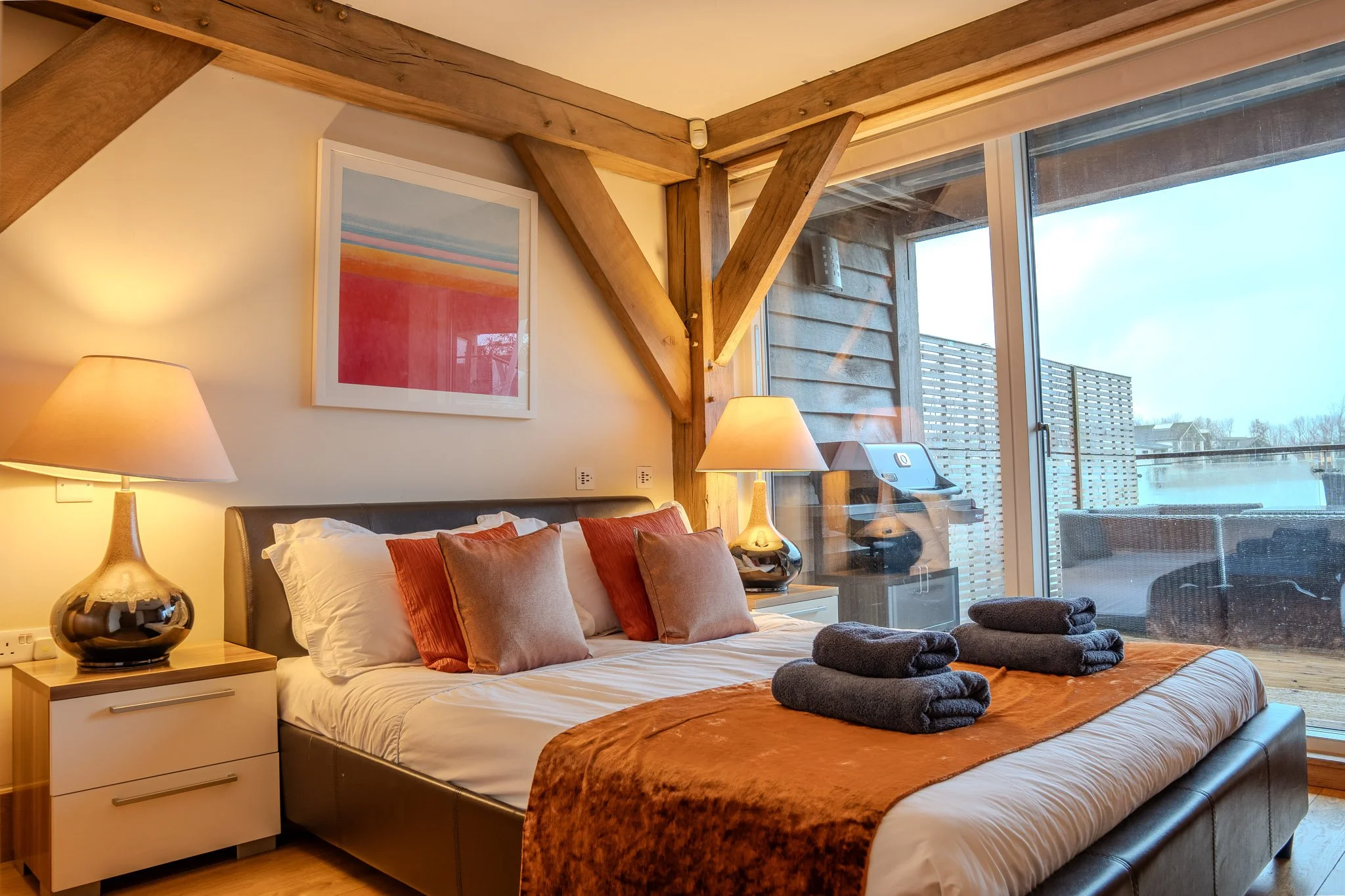 Designed as the showstopper of the home, the middle floor is a masterclass in open-plan living. Soaring oak beams and floor-to-ceiling glass frame the lake, filling the space with natural light. It is a room built for connection—seamlessly linking the sleek, fully equipped kitchen with the lounge, so the cook is never left out of the conversation. Whether you are gathering for a feast, curling up by the wood-burning stove to watch the Sky Glass TV, or stepping onto the upper deck for sunset drinks, the view is always your backdrop.
