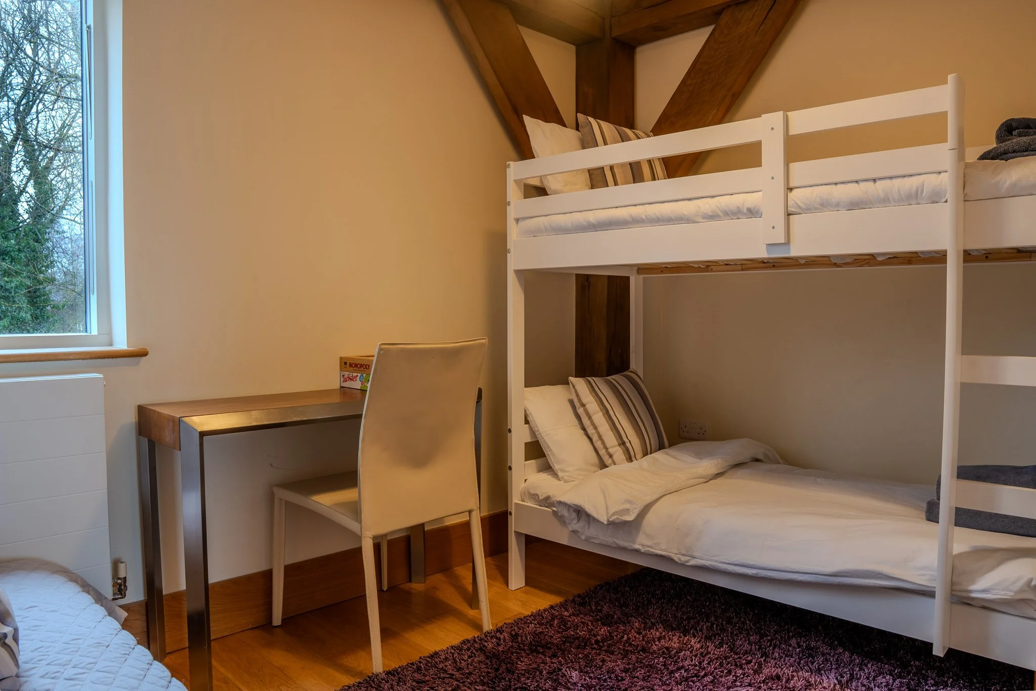 Located on the middle living floor, this versatile space serves two needs. Equipped with bunk beds for the little ones and a dedicated desk workspace for the adults, it allows you to balance family fun with remote working needs.